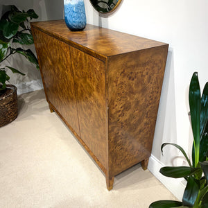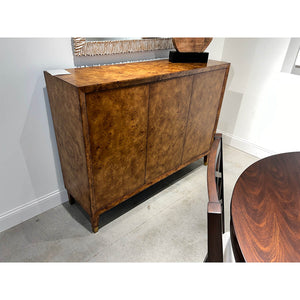 Enhance the sophistication of your living space with the Mid Century Burl Credenza. This exquisite piece showcases a warm 'rustic' hand-rubbed mappa burl veneer, exuding a sense of timeless elegance. Its tall and narrow design makes it a perfect addition to any room, providing both style and functionality.