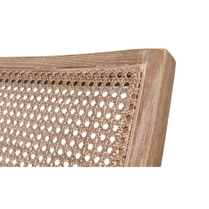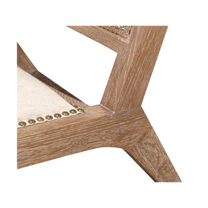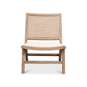 Mid-Century Coastal Side Chair, a low-slung side chair. With a natural lightly whitewashed frame, an inset caned backrest and an off-white linen upholstered seat.