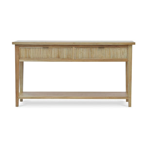 Introduce a touch of mid-century elegance to your home with the Mid Century Console Table - Fruitwood Finish. Crafted from solid mahogany, this beautifully designed console table features ribbed drawer fronts that add texture and character. The two drawers provide ample storage for your essentials, while the lower shelf offers additional space for storage or display, enhancing both functionality and style.