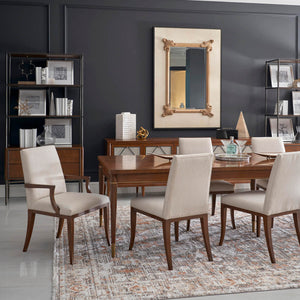 Comfort is paramount in this armchair, with a high back and broad and well-padded seat. Both are upholstered in a neutral performance fabric, carefully chosen for its durability and ease of maintenance. This fabric blends seamlessly with any decor, making it a versatile choice for various dining room styles.
