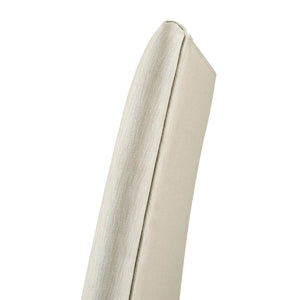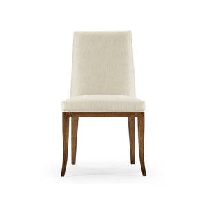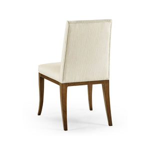 Comfort is paramount in this chair, with a padded back and broad and well-padded seat. Both are upholstered in a neutral performance fabric, carefully chosen for its durability and ease of maintenance. This fabric blends seamlessly with any decor, making it a versatile choice for various dining room styles.