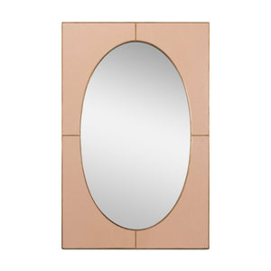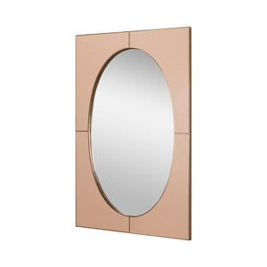 The Mid Century Mushroom Leather Mirror exudes refined elegance with its striking combination of textures and shapes. Featuring an oval beveled mirror, it is beautifully set within a rectangular frame wrapped in cream mushroom shagreen embossed leather. The subtle texture of the embossed leather enhances its luxurious design, while the beveled glass adds depth and sophistication.