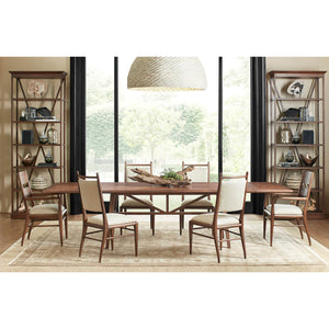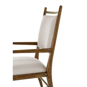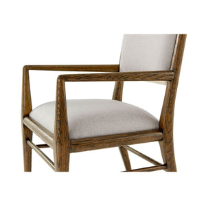 Mid Century style dark oak dining armchair in our Dusk finish, with a padded back and seat upholstered in performance linen fabric adds comfort and sophistication to this timeless design. Raised on tapered legs joined by a supportive stretcher.