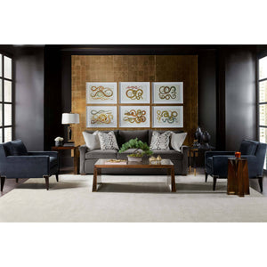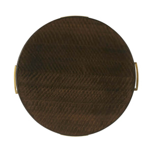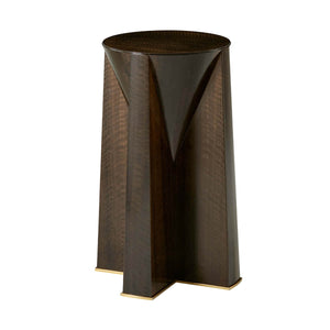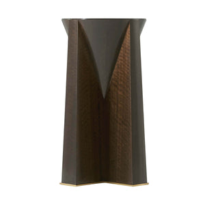 Mid Century Style accent table, a beautifully crafted and delicately fumed eucalyptus table with a stable cone top featuring eucalyptus veneer. Supported by four cross-section feet with distinct brass details on its base.