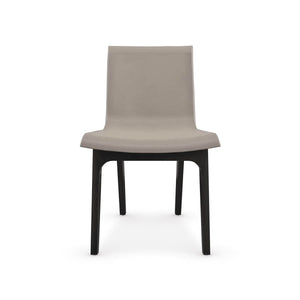 Midnight Modern Leather Dining Chair, a masterful blend of luxury and comfort, the dining chair introduces a simple yet elegant mix of textures and materials. Comfortably curved, the seamless back and seat are dressed in taupe leather, contrasted by wood legs in a dark Basalt finish. A back bar detail adds warmth and hint of shimmer in polished french gold.