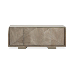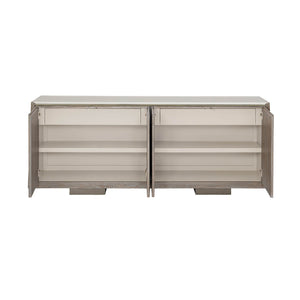 Modern Ash Buffet, a straightforward silhouette showcases its extraordinary linear veneer patterns and is topped with a cream stone top that ensures usability and durability. Block feet and a soft tonal finish of Ash Driftwood convey its relaxed attitude while a bead of Sundance Gold gives the top edge a touch of luxe. Touch-latch doors open to reveal a fully finished interior painted in Putty with plenty of storage and an adjustable shelf and drawer behind each of its four doors.
