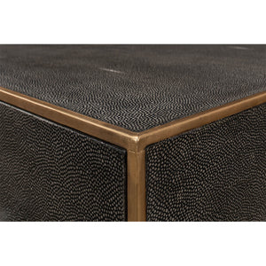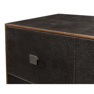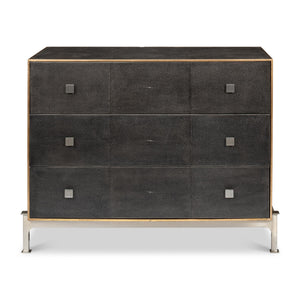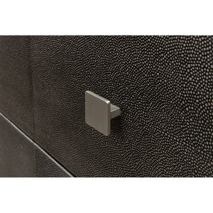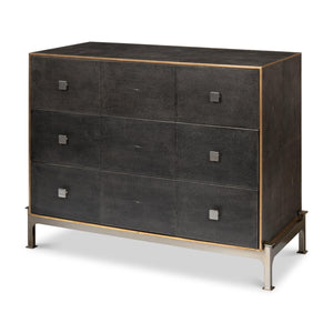 Modern Leather Wrapped Dresser | A modern grey shagreen leather and metal three-drawer chest. This piece has a look of luxury and sophistication with mixed colors, metals, and textures. This chest is covered in a grey textured leather modeled after shagreen or stingray. The cool grey exterior is complimented with elegant brass accents. This piece rests on top of an iron base, it has three drawers for storage lined with marbleized paper.