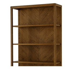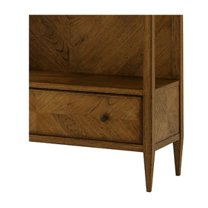 A Modern herringbone parquetry bookcase in our dark oak Dusk finish with three veneered shelves and a herringbone parquetry design on the bottom drawer. It sits on tapered legs with Verde Bronze finished knobs. A beautiful functional piece for storage and displaying treasures.