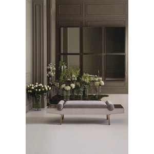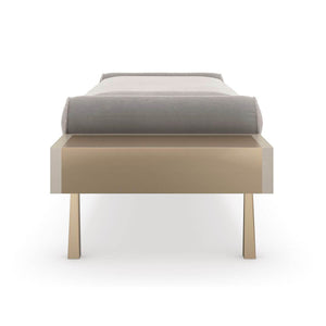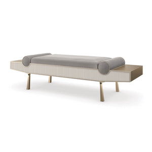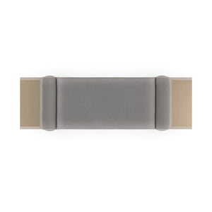 Its sleek design featured recessed bolster pillows and opposing metal wings, perfect for placing a book or decorative object. Brushed gold wraps the ends for a chic finishing touch.