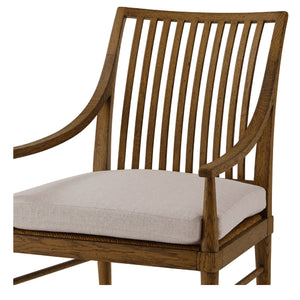 A Modern oak slat-back dining armchair with tapered oak legs. This beautiful chair is crafted with rustic oak and it has a slatted backrest, caned and loosely cushioned seat.