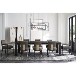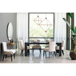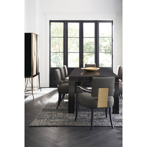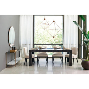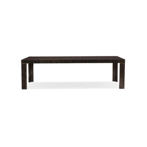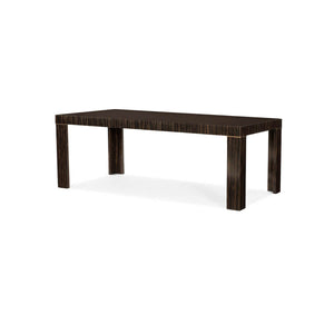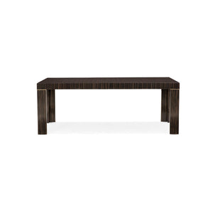 Its clean, simple lines reflect the timeless form of a parson table reinterpreted with a fresh mix of materials. Engineered ebony finished in Striated Ebony with Lucent Bronze Metallic paint trim adds bold character to the table top and legs without taking away from its streamlined form.