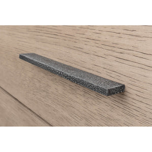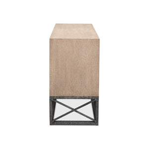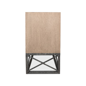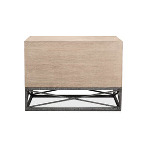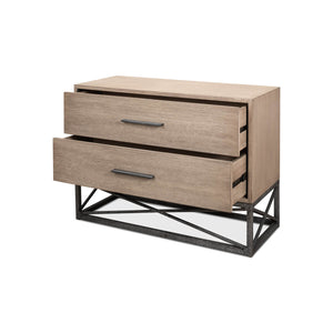 Modern Pine Chest of Drawers, a two-drawer chest with mixed materials and inspired by modern-day architecture. Pine veneered case with hand-forged iron openwork base.