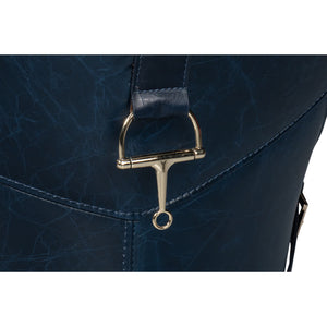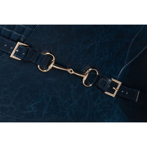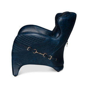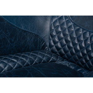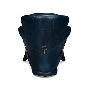 Modern Quilted Blue Leather Armchair with top grain Chateau Blue leather, with a sloping rear and curved arms, with a partially quilted seat and backrest, with decorative buckles.