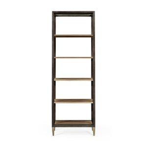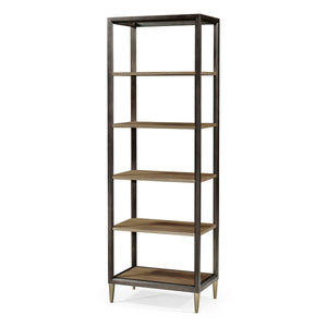 Modern Six Tier Etagere, built from hardwood solids with beveled, ebonized, posts and rails. The shelves feature flat-cut paldao with a light transparent lacquer finish. The feet are brass and are acid-dipped and hand-rubbed to achieve a rich, natural patina.