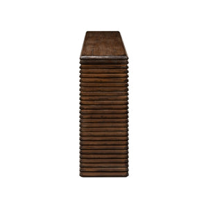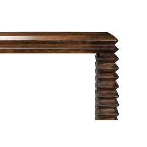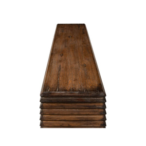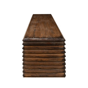Modern Stacked Pine Console Table, made with reclaimed pine in a French brown eclectic stained finish. A simple silhouette wrapped in geometric form with a nod to historical Brutalist design.