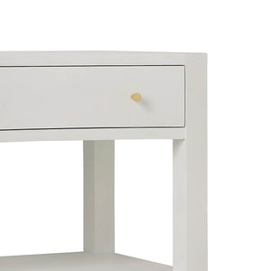 The two drawers offer ample storage space, and the open shelf space is perfect for displaying your favorite decor items. Each drawer comes with a polished brass knob, adding a touch of glamour to the overall design.