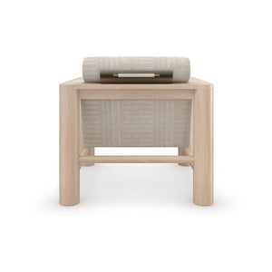 With a pillared Natural Oak frame, softly contrasted by a tactile fabric that introduces a subtle stripe pattern. Decorative metal plate behind head roll finished in Lucent Bronze Metallic Paint.