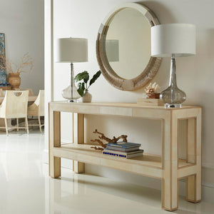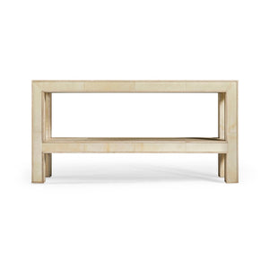Topping this serene design is a pane of inset glass, adding a layer of sophistication that is easy to maintain. Whether gracing an entryway or acting as a sleek stage in a living area, this piece is sure to captivate and charm with its pristine presence