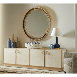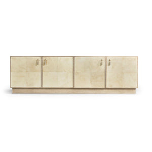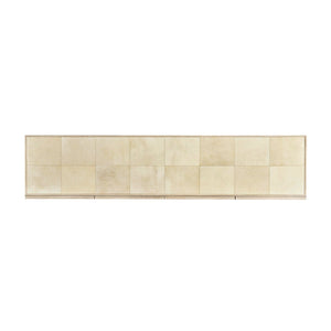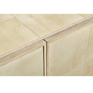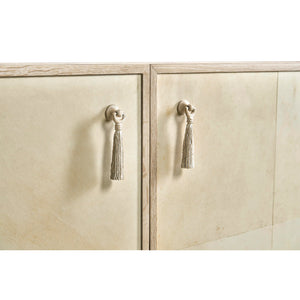 The console’s front features cast brass tassel door pulls, that harmonize with the wooden texture of the frame. Within its spacious interior lie two adjustable shelves, offering customizable storage solutions to accommodate all your entertainment essentials. The inset glass top not only serves as a protective layer for the delicate parchment but also provides a smooth surface that subtly reflects your room's lighting and decor.