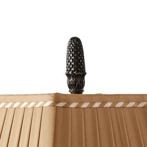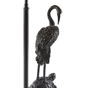A pair of verdigris brass table lamps, each with a crane standing on a turtle, on burl plinth bases, with pleated silk shades. The originals Japanese Meiji period.