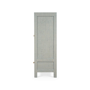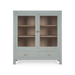 Crafted with meticulous attention to detail, this solid mahogany china cabinet is wrapped in a lovely pale blue raffia that adds a serene and sophisticated touch to your decor. The glass-paneled doors provide a clear view of the spacious interior, finished in a complementary driftwood finish, ideal for displaying your treasured items. With two lower drawers offering additional convenient storage for smaller items, this cabinet ensures your space remains organized and clutter-free.
