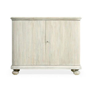 A modern white washed acacia cabinet with reeded sides, a molded edge top, painted interior with adjustable shelves and raised on bun feet.