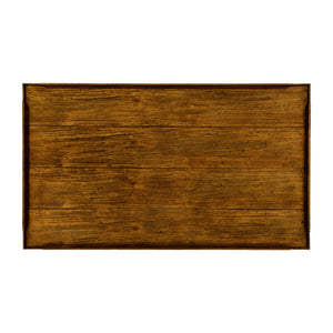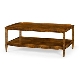 French Rustic Country Coffee Table in a distressed walnut finish with a wooden gallery, square tapered legs and a lower tier shelf.