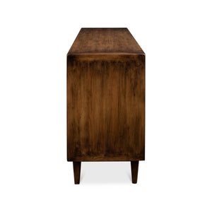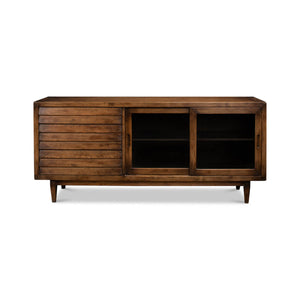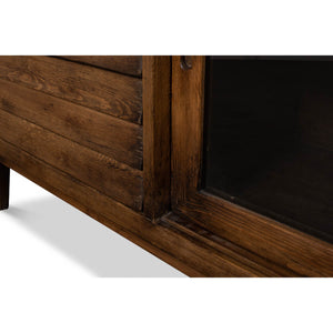 Rustic Reclaimed Pine Credenza with a brown transitional finish, to the right two sliding glass doors and to the left three drawers, all raised on square tapered legs.