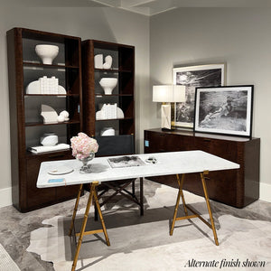 The black finish and graceful curves embody classic Art Deco style, enhancing any decor. Crafted with a stunning Tamo ash veneer, showcasing exceptional quality and attention to detail. Hand-forged hardware in a brass finish creates a striking contrast against the rich wood.