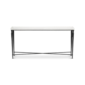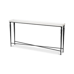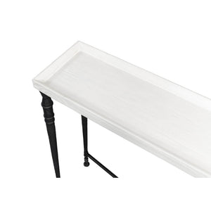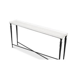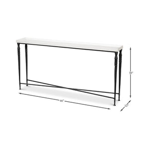 Sleek Art Deco Console Table is a striking blend of minimalist design and classic detailing. This table features a smooth, off-white painted wooden dishtop that sits atop a slender black iron frame.