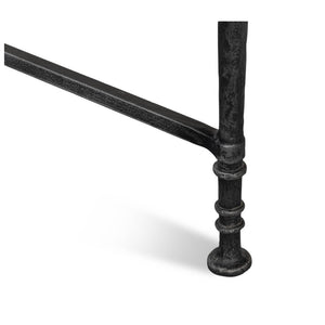 The iron legs boast subtle ornamental accents that hark back to traditional craftsmanship, while the overall simplicity of the design anchors it firmly in the contemporary.