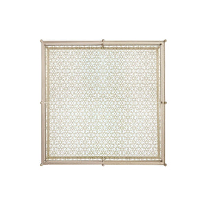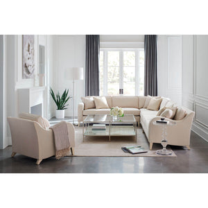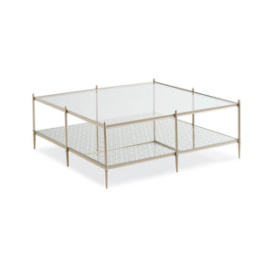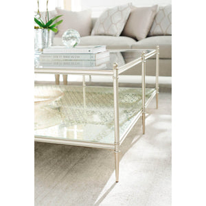 Crafted in a modern mix of materials, its streamlined frame adds a note of luxe in a Neutral metallic finish. A clear glass top reveals a mirrored shelf below, back-painted in a Silver Leaf, mosaic pattern for added dimension.
