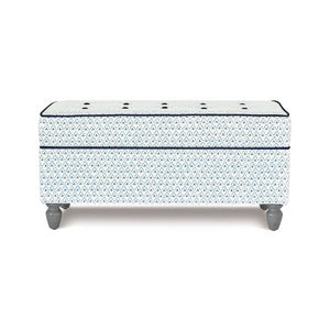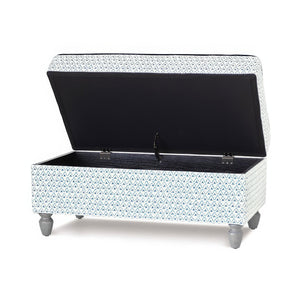 The Trellis Print Storage Ottoman blends style and function with its tailored trellis print fabric and hand-tufted details. A plush, high-density foam cushion ensures comfort, while hand-stained Limestone wooden legs add timeless charm.