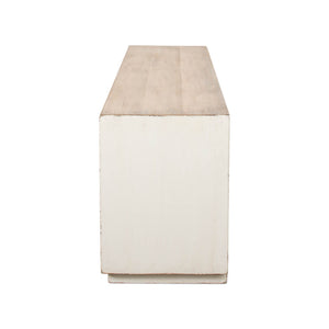 Perfect for a mid-century modern or classic setting, this piece not only serves as a functional asset but also as a statement piece that complements your discerning taste. Made with reclaimed pine and finished in a distressed antique white frame with natural finished doors.