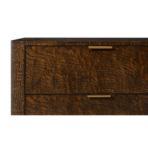 The rich Pyramid Brown finish of the luxurious Tamo ash veneer to the graceful curves embodies classic Art Deco style, enhancing any bedroom decor. Delicate hand-forged hardware to the three drawers in a Satin Brass finish creates a stunning contrast against the rich wood, adding a touch of elegance.