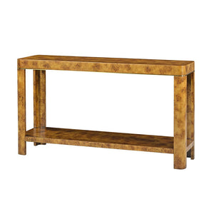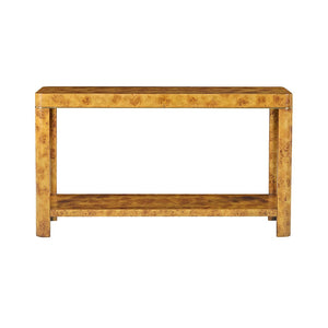 Enhance your entryway or living space with the refined elegance of the Art Deco Burl Console Table. Featuring a minimalist rectangular silhouette, this table is crafted with exquisite golden mappa burl wood veneer that highlights its rich texture and warm tones. The addition of a lower shelf provides both style and functionality, offering ample space for decorative displays or essential storage.
