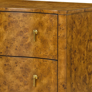The Art Deco Burl Nightstand - Serpentine Front captures timeless glamour with its flowing curves, elegant proportions, and richly figured burl veneer. Finished in a rustic tone on Mappa burl, the piece highlights the natural beauty of the wood grain, creating a surface of depth and movement that feels both luxurious and organic. Two equal-size drawers provide ample storage, accented with refined brass drop hardware that adds a gleaming contrast to the warm burlwood.