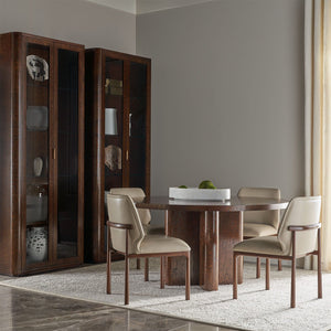 Made from premium beech wood, showcasing gentle curves and a refined design. These chairs are covered in luxurious leather providing a soft and comfortable seating experience. The wood frame is finished in Pyramid Brown, enhancing the natural beauty of the wood.