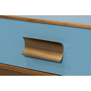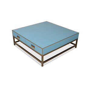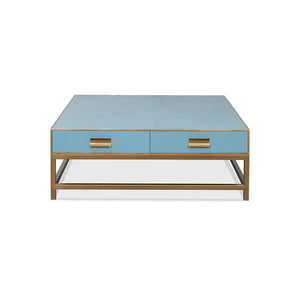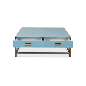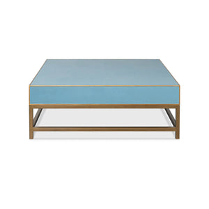 Art Deco Leather Coffee Table in Chambray Blue, crafted from wood with a shagreen embossed leather wrapped top, this square coffee table is finished with gold trim and hardware.