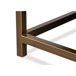 With two drawers and raised on cube-form base with stretchers.The low-profile design makes it ideal for a functional space and the table's striking green hue is complemented by brass-like accents, resulting in a piece that is as much a conversation starter as it is a piece of furniture.