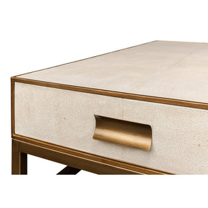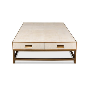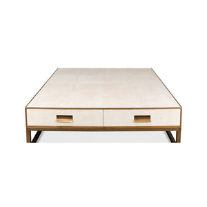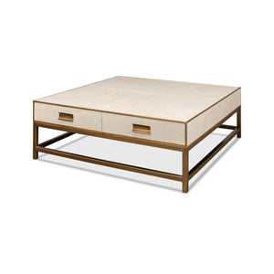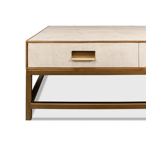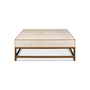 Art Deco Leather Coffee Table in Osprey White, crafted from wood with a shagreen embossed leather wrapped top, this square coffee table is finished with gold trim and hardware.