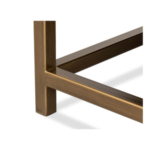 With two drawers and raised on cube-form base with stretchers.The low-profile design makes it ideal for a functional space and the table's striking green hue is complemented by brass-like accents, resulting in a piece that is as much a conversation starter as it is a piece of furniture.