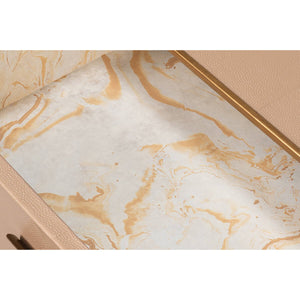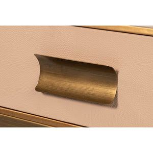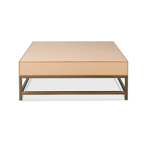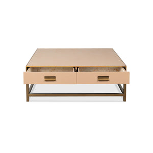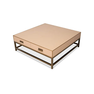 Art Deco Leather Coffee Table in Tan, crafted from wood with a creamy mushroom tan shagreen embossed leather wrapped top, this square coffee table is finished with gold trim and hardware.