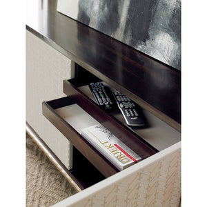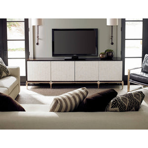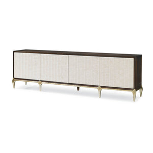 Art Deco Long Cabinet, at 100 inches wide, there couldn’t be a more dramatic centerpiece for both entertainment and design enthusiasts. The face of this cabinet is sure to capture everyone’s attention. Each of the four touch latch doors features over 300 pieces of white faux bone, individually applied and secured with petite, polished brass nail heads. The molded base is finished in Gold Bullion Paint. The cabinet case is made of fumed Eucalyptus veneers and hardwoods finished in a dark French Roast.