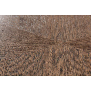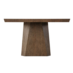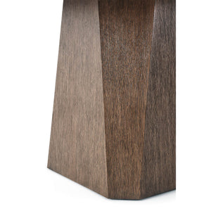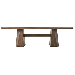 Art Deco style dining table with a brushed quarter oak veneered top with walnut banding and with canted corners on twin tapered geometric pedestal bases and a bold stretcher.