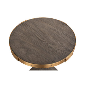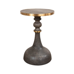 A slender neck adorned with a subtle gold band leads up to the top, where a delicate, brass-edged circular surface offers just enough space for your evening drink or a treasured ornament.
