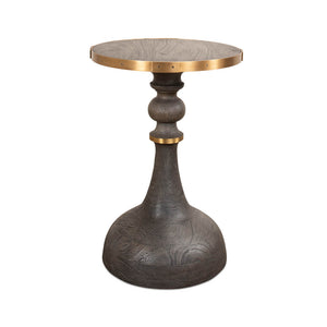 Introducing the Artisan Accent Table – a true conversation starter with its unique 'wine goblet' silhouette and contrasting textures. The table's base, with its bulbous form and intricate wood grain, is finished in a deep, rich tone that highlights the natural beauty of the wood.