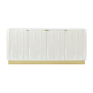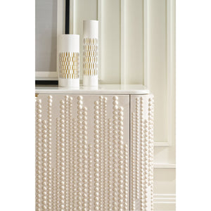 The Beaded Hollywood Regency Four Door Credenza a striking piece that shines with glamour and elegant texture. Meticulously artisan made, it features cascading pearl-like beaded embellishments across both doors, creating a captivating, sculptural effect.