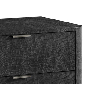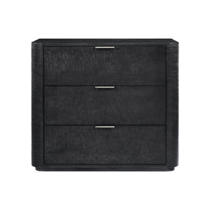 The Silent Black finish of the luxurious Tamo ash veneer to the graceful curves embodies classic Art Deco style, enhancing any bedroom decor. Delicate hand-forged hardware to the three drawers creates a stunning contrast against the rich wood, adding a touch of elegance.