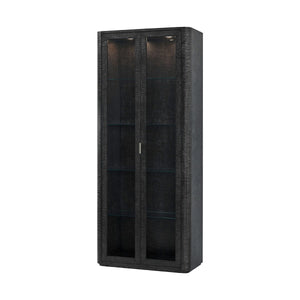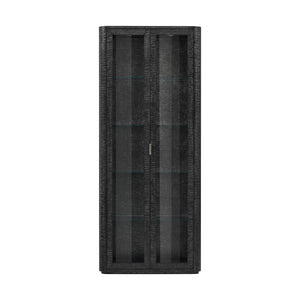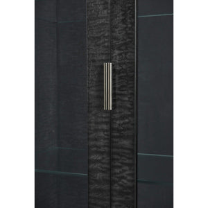 Elevate your home décor with the Black Burl Art Deco Curio Cabinet, showcasing a stunning contrast of sleek glass against a rich Tamo ash burl veneer. Finished in a luxurious silent black finish with brass accents, this cabinet exudes timeless elegance and sophistication.